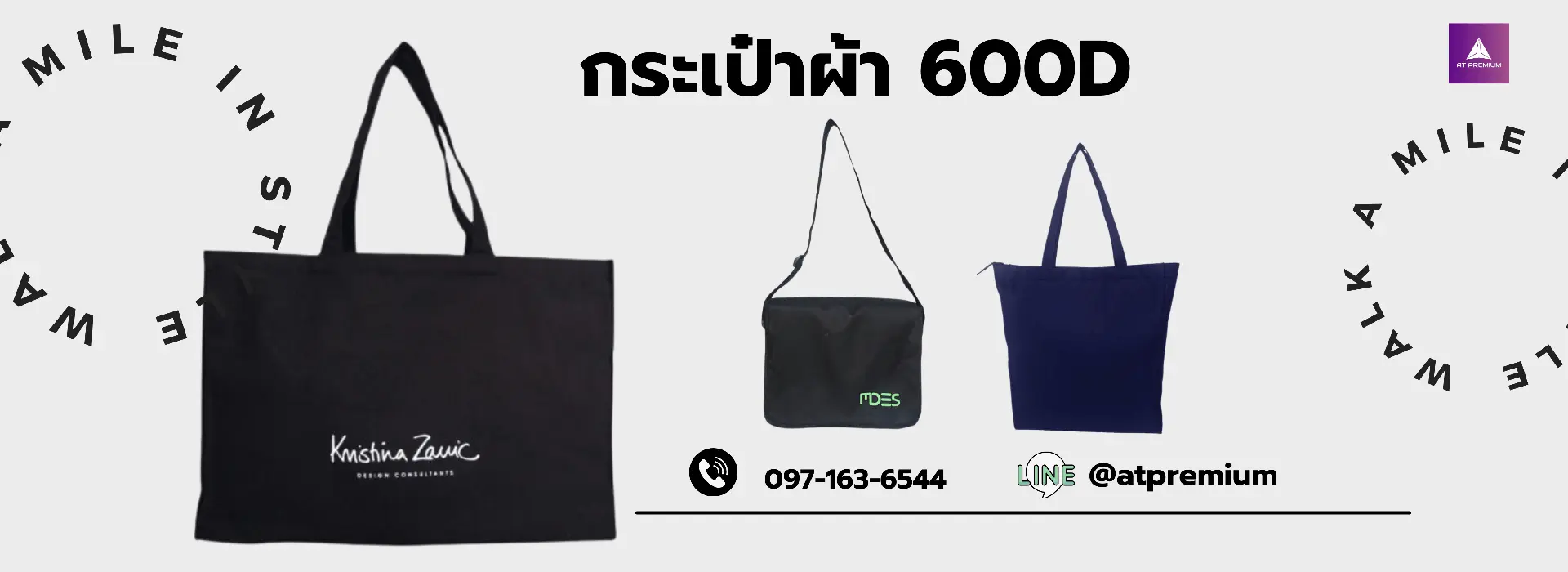 กระเป๋าผ้า 600D เป็นกระเป๋าที่ทำจากผ้าพลาสติกที่มีความหนาและทนทาน โดยมีการทอเส้นใยที่เรียกว่า 600D Polyester ซึ่งเป็นมาตรฐานของความหนาของผ้าที่ใช้ในการผลิตกระเป๋าหรือผลิตภัณฑ์ต่างๆ ที่ต้องการความทนทานสูง โดย “D” ใน 600D หมายถึงการทดสอบความทนทานของเส้นใยผ้าในหน่วย “Denier” ซึ่ง 600D หมายถึงเส้นใยมีความหนาสูงสุดที่ 600 Denier ทำให้กระเป๋าชนิดนี้มีคุณสมบัติที่แข็งแรงและทนทานต่อการใช้งาน กระเป๋าผ้า600D ยังเป็นทางเลือกที่ดีในการทำของพรีเมี่ยม โดยการพิมพ์โลโก้หรือข้อความต่างๆ เพื่อโปรโมทแบรนด์ ด้วยคุณสมบัติที่ทนทานและใช้งานได้หลากหลาย จึงเป็นตัวเลือกที่ยอดเยี่ยมสำหรับผู้ที่ต้องการกระเป๋าคุณภาพสูงในราคาที่คุ้มค่า