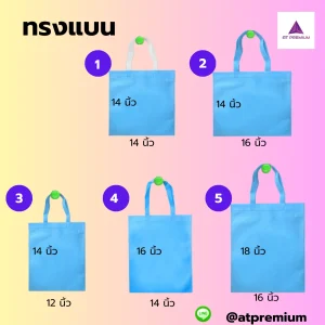 • ลักษณะ: กระเป๋าที่ออกแบบมาเพื่อใช้ในการส่งเสริมการขาย โดยพิมพ์โลโก้และข้อความเกี่ยวกับแบรนด์ให้ชัดเจน